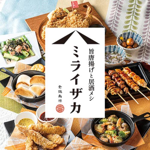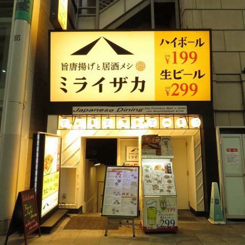 <ミライザカ>で味わえるのは、見た目のインパクトも満点な名物「骨付モモ一本グローブ揚げ」を筆頭に、刺身や鉄板料理、農園直送のサラダなど、ジャンルを越えた“旨い”が詰まった居酒メシ。